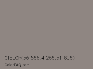 CIELCh 56.586,4.268,51.818 Color is a normal orange color and the nearest color is Natural Gray #8b8680. Hex code #8f8682 and RGB value is rgb(143,134,130). In RGB color space, this color is composed of 56% red, 53% green, 51% blue, In CMYK color space, this color is composed of 0% cyan, 6% magenta, 9% yellow , 44% black , In HSL color space, this color has a hue angle of 18° , 5% saturation and 54% lightness.