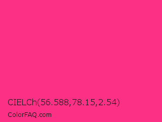 CIELCh 56.588,78.15,2.54 Color is a normal rose color and the nearest color is Cerise Pink #ec3b83. Hex code #fc3085 and RGB value is rgb(252,48,133). In RGB color space, this color is composed of 99% red, 19% green, 52% blue, In CMYK color space, this color is composed of 0% cyan, 81% magenta, 47% yellow , 1% black , In HSL color space, this color has a hue angle of 335° , 97% saturation and 59% lightness.