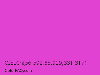 CIELCh 56.592,85.919,331.317 Color is a normal magenta color and the nearest color is Steel Pink #cc33cc. Hex code #e142d1 and RGB value is rgb(225,66,209). In RGB color space, this color is composed of 88% red, 26% green, 82% blue, In CMYK color space, this color is composed of 0% cyan, 71% magenta, 7% yellow , 12% black , In HSL color space, this color has a hue angle of 306° , 73% saturation and 57% lightness.