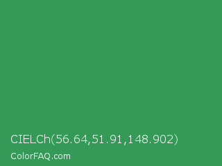 CIELCh 56.64,51.91,148.902 Color is a normal green color and the nearest color is Sea Green #2e8b57. Hex code #359a57 and RGB value is rgb(53,154,87). In RGB color space, this color is composed of 21% red, 60% green, 34% blue, In CMYK color space, this color is composed of 66% cyan, 0% magenta, 44% yellow , 40% black , In HSL color space, this color has a hue angle of 140° , 49% saturation and 41% lightness.