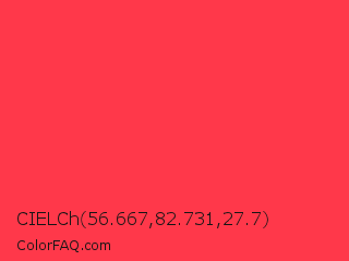 CIELCh 56.667,82.731,27.7 Color is a light red color and the nearest color is Red Salsa #fd3a4a. Hex code #ff384a and RGB value is rgb(255,56,74). In RGB color space, this color is composed of 100% red, 22% green, 29% blue, In CMYK color space, this color is composed of 0% cyan, 78% magenta, 71% yellow , 0% black , In HSL color space, this color has a hue angle of 355° , 100% saturation and 61% lightness.
