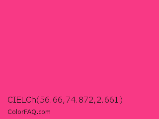 CIELCh 56.66,74.872,2.661 Color is a normal rose color and the nearest color is Cerise Pink #ec3b83. Hex code #f83985 and RGB value is rgb(248,57,133). In RGB color space, this color is composed of 97% red, 22% green, 52% blue, In CMYK color space, this color is composed of 0% cyan, 77% magenta, 46% yellow , 3% black , In HSL color space, this color has a hue angle of 336° , 93% saturation and 60% lightness.
