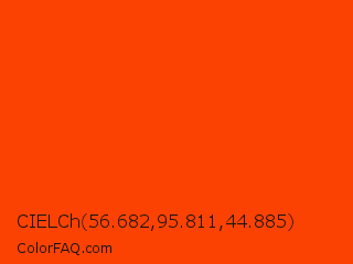 CIELCh 56.682,95.811,44.885 Color is a normal color and the nearest color is Orange Red #ff4500. Hex code #fc4203 and RGB value is rgb(252,66,3). In RGB color space, this color is composed of 99% red, 26% green, 1% blue, In CMYK color space, this color is composed of 0% cyan, 74% magenta, 99% yellow , 1% black , In HSL color space, this color has a hue angle of 15° , 98% saturation and 50% lightness.