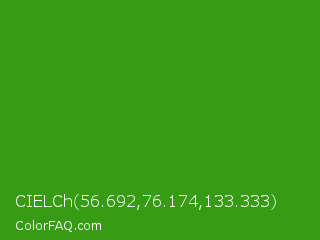 CIELCh 56.692,76.174,133.333 Color is a normal green color and the nearest color is Slimy Green #299617. Hex code #369c13 and RGB value is rgb(54,156,19). In RGB color space, this color is composed of 21% red, 61% green, 7% blue, In CMYK color space, this color is composed of 65% cyan, 0% magenta, 88% yellow , 39% black , In HSL color space, this color has a hue angle of 105° , 78% saturation and 34% lightness.