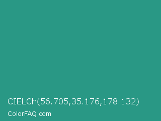 CIELCh 56.705,35.176,178.132 Color is a normal cyan color and the nearest color is Lochinvar #2c8c84. Hex code #299885 and RGB value is rgb(41,152,133). In RGB color space, this color is composed of 16% red, 60% green, 52% blue, In CMYK color space, this color is composed of 73% cyan, 0% magenta, 13% yellow , 40% black , In HSL color space, this color has a hue angle of 170° , 58% saturation and 38% lightness.