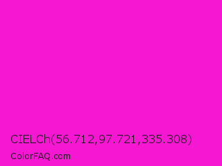 CIELCh 56.712,97.721,335.308 Color is a normal magenta color and the nearest color is Hot Magenta #ff1dce. Hex code #f517d1 and RGB value is rgb(245,23,209). In RGB color space, this color is composed of 96% red, 9% green, 82% blue, In CMYK color space, this color is composed of 0% cyan, 91% magenta, 15% yellow , 4% black , In HSL color space, this color has a hue angle of 310° , 92% saturation and 53% lightness.