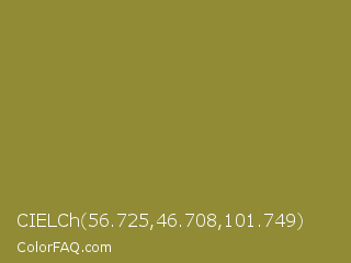 CIELCh 56.725,46.708,101.749 Color is a normal yellow color and the nearest color is Sycamore #908d39. Hex code #908b34 and RGB value is rgb(144,139,52). In RGB color space, this color is composed of 56% red, 55% green, 20% blue, In CMYK color space, this color is composed of 0% cyan, 3% magenta, 64% yellow , 44% black , In HSL color space, this color has a hue angle of 57° , 47% saturation and 38% lightness.