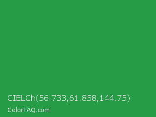 CIELCh 56.733,61.858,144.75 Color is a normal green color and the nearest color is Sea Green #2e8b57. Hex code #279c46 and RGB value is rgb(39,156,70). In RGB color space, this color is composed of 15% red, 61% green, 27% blue, In CMYK color space, this color is composed of 75% cyan, 0% magenta, 55% yellow , 39% black , In HSL color space, this color has a hue angle of 136° , 60% saturation and 38% lightness.