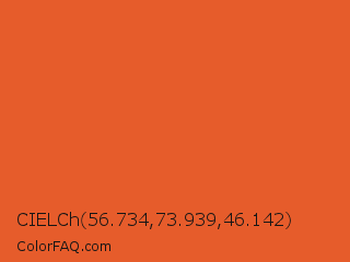 CIELCh 56.734,73.939,46.142 Color is a normal orange color and the nearest color is Vivid Vermilion #e56024. Hex code #e65c2b and RGB value is rgb(230,92,43). In RGB color space, this color is composed of 90% red, 36% green, 17% blue, In CMYK color space, this color is composed of 0% cyan, 60% magenta, 81% yellow , 10% black , In HSL color space, this color has a hue angle of 16° , 79% saturation and 54% lightness.