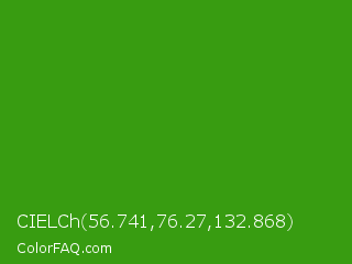CIELCh 56.741,76.27,132.868 Color is a normal green color and the nearest color is Slimy Green #299617. Hex code #389c11 and RGB value is rgb(56,156,17). In RGB color space, this color is composed of 22% red, 61% green, 7% blue, In CMYK color space, this color is composed of 64% cyan, 0% magenta, 89% yellow , 39% black , In HSL color space, this color has a hue angle of 103° , 80% saturation and 34% lightness.