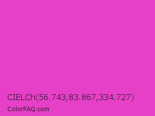 CIELCh 56.743,83.867,334.727 Color is a normal magenta color and the nearest color is Razzle Dazzle Rose #ff33cc. Hex code #e640c8 and RGB value is rgb(230,64,200). In RGB color space, this color is composed of 90% red, 25% green, 78% blue, In CMYK color space, this color is composed of 0% cyan, 72% magenta, 13% yellow , 10% black , In HSL color space, this color has a hue angle of 311° , 77% saturation and 58% lightness.