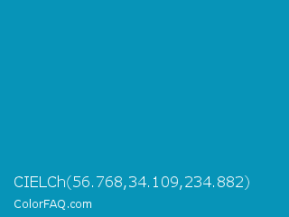 CIELCh 56.768,34.109,234.882 Color is a normal cyan color and the nearest color is Bondi Blue #0095b6. Hex code #0794b8 and RGB value is rgb(7,148,184). In RGB color space, this color is composed of 3% red, 58% green, 72% blue, In CMYK color space, this color is composed of 96% cyan, 20% magenta, 0% yellow , 28% black , In HSL color space, this color has a hue angle of 192° , 93% saturation and 37% lightness.