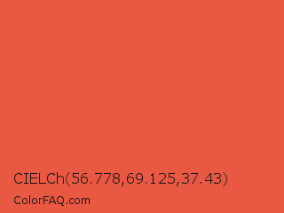 CIELCh 56.778,69.125,37.43 Color is a normal red color and the nearest color is Carmine Pink #eb4c42. Hex code #e95842 and RGB value is rgb(233,88,66). In RGB color space, this color is composed of 91% red, 35% green, 26% blue, In CMYK color space, this color is composed of 0% cyan, 62% magenta, 72% yellow , 9% black , In HSL color space, this color has a hue angle of 8° , 79% saturation and 59% lightness.