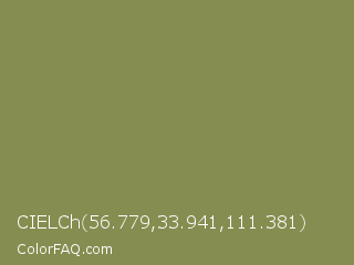 CIELCh 56.779,33.941,111.381 Color is a normal yellow color and the nearest color is Dark Tan #918151. Hex code #868d50 and RGB value is rgb(134,141,80). In RGB color space, this color is composed of 53% red, 55% green, 31% blue, In CMYK color space, this color is composed of 5% cyan, 0% magenta, 43% yellow , 45% black , In HSL color space, this color has a hue angle of 67° , 28% saturation and 43% lightness.