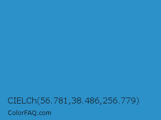 CIELCh 56.781,38.486,256.779 Color is a normal blue color and the nearest color is Curious Blue #2596d1. Hex code #2c90c9 and RGB value is rgb(44,144,201). In RGB color space, this color is composed of 17% red, 56% green, 79% blue, In CMYK color space, this color is composed of 78% cyan, 28% magenta, 0% yellow , 21% black , In HSL color space, this color has a hue angle of 202° , 64% saturation and 48% lightness.