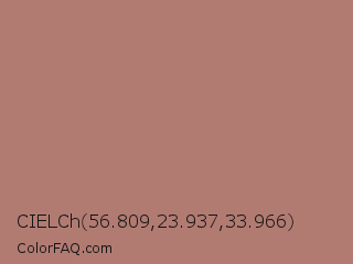 CIELCh 56.809,23.937,33.966 Color is a normal red color and the nearest color is Copper Penny #ad6f69. Hex code #b17b72 and RGB value is rgb(177,123,114). In RGB color space, this color is composed of 69% red, 48% green, 45% blue, In CMYK color space, this color is composed of 0% cyan, 31% magenta, 36% yellow , 31% black , In HSL color space, this color has a hue angle of 9° , 29% saturation and 57% lightness.