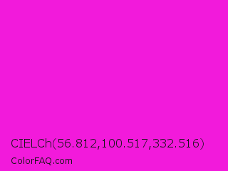 CIELCh 56.812,100.517,332.516 Color is a normal magenta color and the nearest color is Hot Magenta #ff1dce. Hex code #f21adb and RGB value is rgb(242,26,219). In RGB color space, this color is composed of 95% red, 10% green, 86% blue, In CMYK color space, this color is composed of 0% cyan, 89% magenta, 10% yellow , 5% black , In HSL color space, this color has a hue angle of 306° , 89% saturation and 53% lightness.