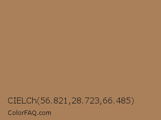 CIELCh 56.821,28.723,66.485 Color is a normal orange color and the nearest color is French Beige #a67b5b. Hex code #aa805b and RGB value is rgb(170,128,91). In RGB color space, this color is composed of 67% red, 50% green, 36% blue, In CMYK color space, this color is composed of 0% cyan, 25% magenta, 46% yellow , 33% black , In HSL color space, this color has a hue angle of 28° , 32% saturation and 51% lightness.