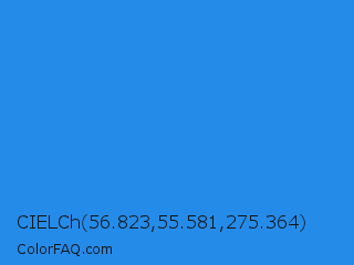 CIELCh 56.823,55.581,275.364 Color is a normal blue color and the nearest color is Bleu De France #318ce7. Hex code #258be9 and RGB value is rgb(37,139,233). In RGB color space, this color is composed of 15% red, 55% green, 91% blue, In CMYK color space, this color is composed of 84% cyan, 40% magenta, 0% yellow , 9% black , In HSL color space, this color has a hue angle of 209° , 82% saturation and 53% lightness.