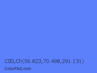 CIELCh 56.823,70.498,291.131 Color is a light blue color and the nearest color is Blueberry #4f86f7. Hex code #5c80fc and RGB value is rgb(92,128,252). In RGB color space, this color is composed of 36% red, 50% green, 99% blue, In CMYK color space, this color is composed of 63% cyan, 49% magenta, 0% yellow , 1% black , In HSL color space, this color has a hue angle of 227° , 96% saturation and 67% lightness.