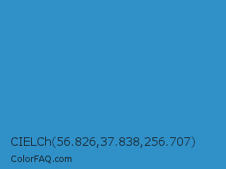 CIELCh 56.826,37.838,256.707 Color is a normal blue color and the nearest color is Curious Blue #2596d1. Hex code #3090c8 and RGB value is rgb(48,144,200). In RGB color space, this color is composed of 19% red, 56% green, 78% blue, In CMYK color space, this color is composed of 76% cyan, 28% magenta, 0% yellow , 22% black , In HSL color space, this color has a hue angle of 202° , 61% saturation and 49% lightness.