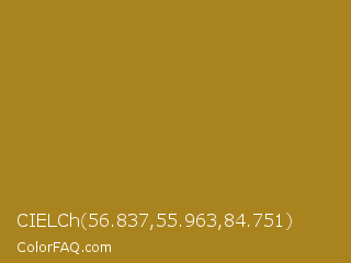 CIELCh 56.837,55.963,84.751 Color is a normal orange color and the nearest color is Reef Gold #9f821c. Hex code #a9831d and RGB value is rgb(169,131,29). In RGB color space, this color is composed of 66% red, 51% green, 11% blue, In CMYK color space, this color is composed of 0% cyan, 22% magenta, 83% yellow , 34% black , In HSL color space, this color has a hue angle of 44° , 71% saturation and 39% lightness.