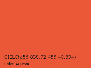 CIELCh 56.838,72.456,40.834 Color is a normal red color and the nearest color is Carmine Pink #eb4c42. Hex code #ea5838 and RGB value is rgb(234,88,56). In RGB color space, this color is composed of 92% red, 35% green, 22% blue, In CMYK color space, this color is composed of 0% cyan, 62% magenta, 76% yellow , 8% black , In HSL color space, this color has a hue angle of 11° , 81% saturation and 57% lightness.