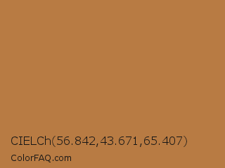 CIELCh 56.842,43.671,65.407 Color is a normal orange color and the nearest color is Copper #b87333. Hex code #b87b43 and RGB value is rgb(184,123,67). In RGB color space, this color is composed of 72% red, 48% green, 26% blue, In CMYK color space, this color is composed of 0% cyan, 33% magenta, 64% yellow , 28% black , In HSL color space, this color has a hue angle of 29° , 47% saturation and 49% lightness.