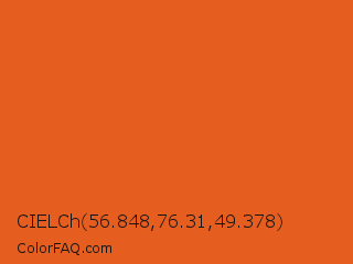 CIELCh 56.848,76.31,49.378 Color is a normal orange color and the nearest color is Vivid Vermilion #e56024. Hex code #e55e20 and RGB value is rgb(229,94,32). In RGB color space, this color is composed of 90% red, 37% green, 13% blue, In CMYK color space, this color is composed of 0% cyan, 59% magenta, 86% yellow , 10% black , In HSL color space, this color has a hue angle of 19° , 79% saturation and 51% lightness.