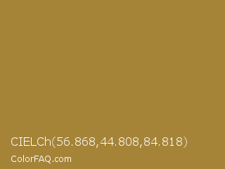CIELCh 56.868,44.808,84.818 Color is a normal orange color and the nearest color is Metallic Sunburst #9c7c38. Hex code #a58438 and RGB value is rgb(165,132,56). In RGB color space, this color is composed of 65% red, 52% green, 22% blue, In CMYK color space, this color is composed of 0% cyan, 20% magenta, 66% yellow , 35% black , In HSL color space, this color has a hue angle of 42° , 49% saturation and 43% lightness.