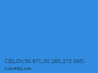 CIELCh 56.871,50.285,272.695 Color is a normal blue color and the nearest color is Bleu De France #318ce7. Hex code #318ce0 and RGB value is rgb(49,140,224). In RGB color space, this color is composed of 19% red, 55% green, 88% blue, In CMYK color space, this color is composed of 78% cyan, 38% magenta, 0% yellow , 12% black , In HSL color space, this color has a hue angle of 209° , 74% saturation and 54% lightness.