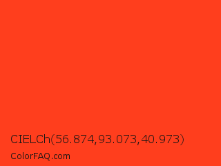 CIELCh 56.874,93.073,40.973 Color is a normal red color and the nearest color is Pomegranate #f34723. Hex code #ff3e1d and RGB value is rgb(255,62,29). In RGB color space, this color is composed of 100% red, 24% green, 11% blue, In CMYK color space, this color is composed of 0% cyan, 76% magenta, 89% yellow , 0% black , In HSL color space, this color has a hue angle of 9° , 100% saturation and 56% lightness.