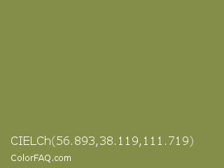 CIELCh 56.893,38.119,111.719 Color is a normal yellow color and the nearest color is Dark Tan #918151. Hex code #858e49 and RGB value is rgb(133,142,73). In RGB color space, this color is composed of 52% red, 56% green, 29% blue, In CMYK color space, this color is composed of 6% cyan, 0% magenta, 49% yellow , 44% black , In HSL color space, this color has a hue angle of 68° , 32% saturation and 42% lightness.