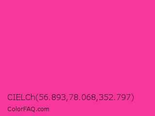 CIELCh 56.893,78.068,352.797 Color is a normal rose color and the nearest color is Wild Strawberry Crayola #ff3399. Hex code #f7369c and RGB value is rgb(247,54,156). In RGB color space, this color is composed of 97% red, 21% green, 61% blue, In CMYK color space, this color is composed of 0% cyan, 78% magenta, 37% yellow , 3% black , In HSL color space, this color has a hue angle of 328° , 92% saturation and 59% lightness.