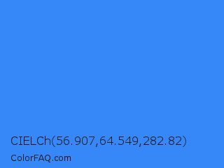 CIELCh 56.907,64.549,282.82 Color is a normal blue color and the nearest color is Bleu De France #318ce7. Hex code #3687f7 and RGB value is rgb(54,135,247). In RGB color space, this color is composed of 21% red, 53% green, 97% blue, In CMYK color space, this color is composed of 78% cyan, 45% magenta, 0% yellow , 3% black , In HSL color space, this color has a hue angle of 215° , 92% saturation and 59% lightness.