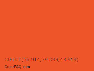 CIELCh 56.914,79.093,43.919 Color is a normal red color and the nearest color is Flamingo #f2552a. Hex code #ee5529 and RGB value is rgb(238,85,41). In RGB color space, this color is composed of 93% red, 33% green, 16% blue, In CMYK color space, this color is composed of 0% cyan, 64% magenta, 83% yellow , 7% black , In HSL color space, this color has a hue angle of 13° , 85% saturation and 55% lightness.