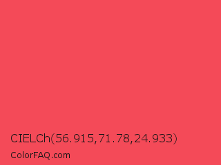 CIELCh 56.915,71.78,24.933 Color is a light red color and the nearest color is Desire #ea3c53. Hex code #f44a58 and RGB value is rgb(244,74,88). In RGB color space, this color is composed of 96% red, 29% green, 35% blue, In CMYK color space, this color is composed of 0% cyan, 70% magenta, 64% yellow , 4% black , In HSL color space, this color has a hue angle of 355° , 89% saturation and 62% lightness.