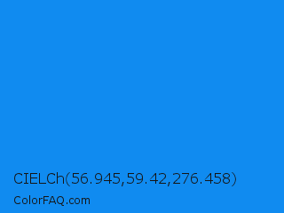 CIELCh 56.945,59.42,276.458 Color is a normal blue color and the nearest color is Dodger Blue #1e90ff. Hex code #108bf0 and RGB value is rgb(16,139,240). In RGB color space, this color is composed of 6% red, 55% green, 94% blue, In CMYK color space, this color is composed of 93% cyan, 42% magenta, 0% yellow , 6% black , In HSL color space, this color has a hue angle of 207° , 88% saturation and 50% lightness.