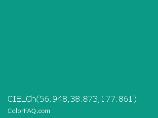 CIELCh 56.948,38.873,177.861 Color is a normal cyan color and the nearest color is Gossamer #069b81. Hex code #0a9a85 and RGB value is rgb(10,154,133). In RGB color space, this color is composed of 4% red, 60% green, 52% blue, In CMYK color space, this color is composed of 94% cyan, 0% magenta, 14% yellow , 40% black , In HSL color space, this color has a hue angle of 171° , 88% saturation and 32% lightness.