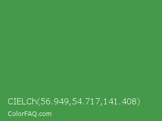 CIELCh 56.949,54.717,141.408 Color is a normal green color and the nearest color is May Green #4c9141. Hex code #459a4a and RGB value is rgb(69,154,74). In RGB color space, this color is composed of 27% red, 60% green, 29% blue, In CMYK color space, this color is composed of 55% cyan, 0% magenta, 52% yellow , 40% black , In HSL color space, this color has a hue angle of 124° , 38% saturation and 44% lightness.