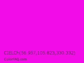 CIELCh 56.957,105.823,330.332 Color is a normal magenta color and the nearest color is Magenta / Fuchsia #ff00ff. Hex code #f20de6 and RGB value is rgb(242,13,230). In RGB color space, this color is composed of 95% red, 5% green, 90% blue, In CMYK color space, this color is composed of 0% cyan, 95% magenta, 5% yellow , 5% black , In HSL color space, this color has a hue angle of 303° , 90% saturation and 50% lightness.