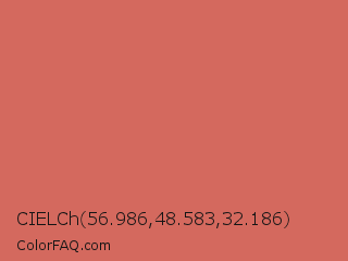 CIELCh 56.986,48.583,32.186 Color is a normal red color and the nearest color is Fuzzy Wuzzy #cc6666. Hex code #d4695e and RGB value is rgb(212,105,94). In RGB color space, this color is composed of 83% red, 41% green, 37% blue, In CMYK color space, this color is composed of 0% cyan, 50% magenta, 56% yellow , 17% black , In HSL color space, this color has a hue angle of 6° , 58% saturation and 60% lightness.