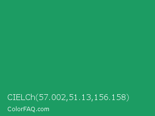CIELCh 57.002,51.13,156.158 Color is a normal green color and the nearest color is Eucalyptus #278a5b. Hex code #1c9c63 and RGB value is rgb(28,156,99). In RGB color space, this color is composed of 11% red, 61% green, 39% blue, In CMYK color space, this color is composed of 82% cyan, 0% magenta, 37% yellow , 39% black , In HSL color space, this color has a hue angle of 153° , 70% saturation and 36% lightness.