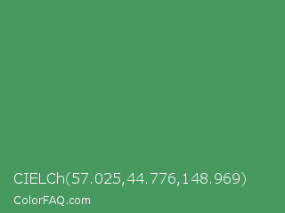 CIELCh 57.025,44.776,148.969 Color is a normal green color and the nearest color is Fruit Salad #4f9d5d. Hex code #47995f and RGB value is rgb(71,153,95). In RGB color space, this color is composed of 28% red, 60% green, 37% blue, In CMYK color space, this color is composed of 54% cyan, 0% magenta, 38% yellow , 40% black , In HSL color space, this color has a hue angle of 138° , 37% saturation and 44% lightness.