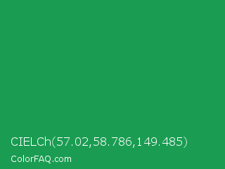 CIELCh 57.02,58.786,149.485 Color is a normal green color and the nearest color is Eucalyptus #278a5b. Hex code #1a9d52 and RGB value is rgb(26,157,82). In RGB color space, this color is composed of 10% red, 62% green, 32% blue, In CMYK color space, this color is composed of 83% cyan, 0% magenta, 48% yellow , 38% black , In HSL color space, this color has a hue angle of 146° , 72% saturation and 36% lightness.
