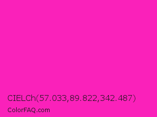 CIELCh 57.033,89.822,342.487 Color is a normal magenta color and the nearest color is Shocking Pink #fc0fc0. Hex code #fa21ba and RGB value is rgb(250,33,186). In RGB color space, this color is composed of 98% red, 13% green, 73% blue, In CMYK color space, this color is composed of 0% cyan, 87% magenta, 26% yellow , 2% black , In HSL color space, this color has a hue angle of 318° , 96% saturation and 55% lightness.