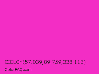 CIELCh 57.039,89.759,338.113 Color is a normal magenta color and the nearest color is Razzle Dazzle Rose #ff33cc. Hex code #f32dc5 and RGB value is rgb(243,45,197). In RGB color space, this color is composed of 95% red, 18% green, 77% blue, In CMYK color space, this color is composed of 0% cyan, 81% magenta, 19% yellow , 5% black , In HSL color space, this color has a hue angle of 314° , 89% saturation and 56% lightness.