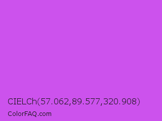 CIELCh 57.062,89.577,320.908 Color is a light purple color and the nearest color is Medium Orchid #ba55d3. Hex code #cc52ed and RGB value is rgb(204,82,237). In RGB color space, this color is composed of 80% red, 32% green, 93% blue, In CMYK color space, this color is composed of 14% cyan, 65% magenta, 0% yellow , 7% black , In HSL color space, this color has a hue angle of 287° , 81% saturation and 63% lightness.