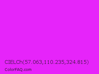 CIELCh 57.063,110.235,324.815 Color is a normal magenta color and the nearest color is Phlox #df00ff. Hex code #e624fa and RGB value is rgb(230,36,250). In RGB color space, this color is composed of 90% red, 14% green, 98% blue, In CMYK color space, this color is composed of 8% cyan, 86% magenta, 0% yellow , 2% black , In HSL color space, this color has a hue angle of 294° , 96% saturation and 56% lightness.
