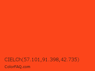 CIELCh 57.101,91.398,42.735 Color is a normal red color and the nearest color is Orioles Orange #fb4f14. Hex code #fc451a and RGB value is rgb(252,69,26). In RGB color space, this color is composed of 99% red, 27% green, 10% blue, In CMYK color space, this color is composed of 0% cyan, 73% magenta, 90% yellow , 1% black , In HSL color space, this color has a hue angle of 11° , 97% saturation and 55% lightness.